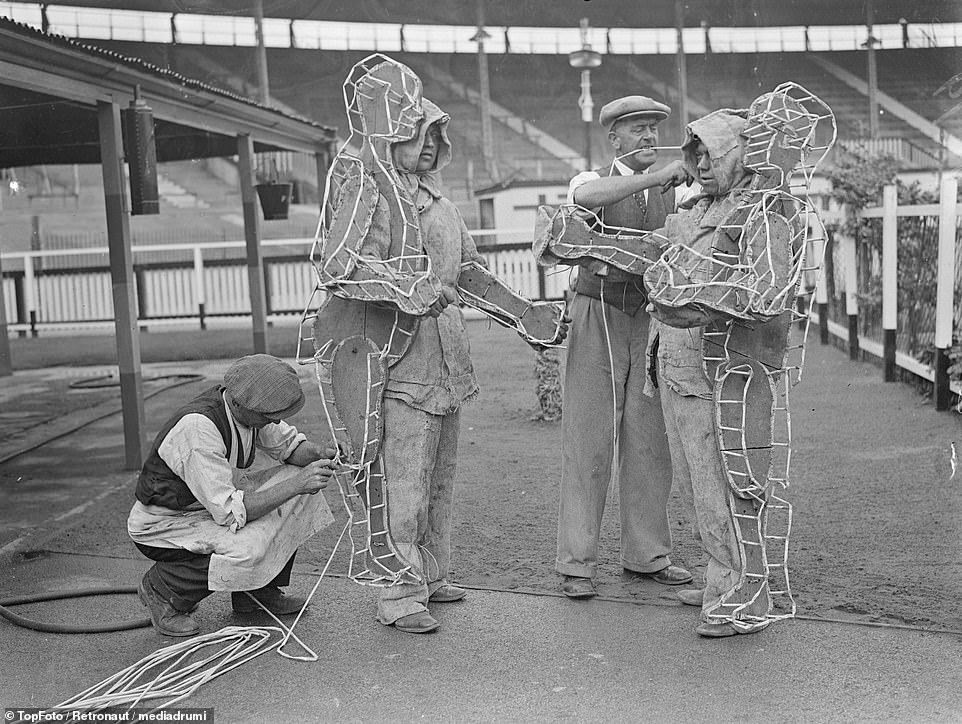 As you can see from these incredible black and white photos, in the 1930’s, London firework spectacles at venues like White Castle and Crystal Palace, displays would involve men being transformed into ‘human fireworks’, as they prepare to be set alight with a set of explosives strapped to their bodies, and fight one another, protected only by white asbestos suits. The suits were intended to protect the wearer from heat and sparks, since asbestos was once hailed as a ‘miracle fibre’ for its fire resistance. Of course, we now know the serious health risks of asbestos exposure.